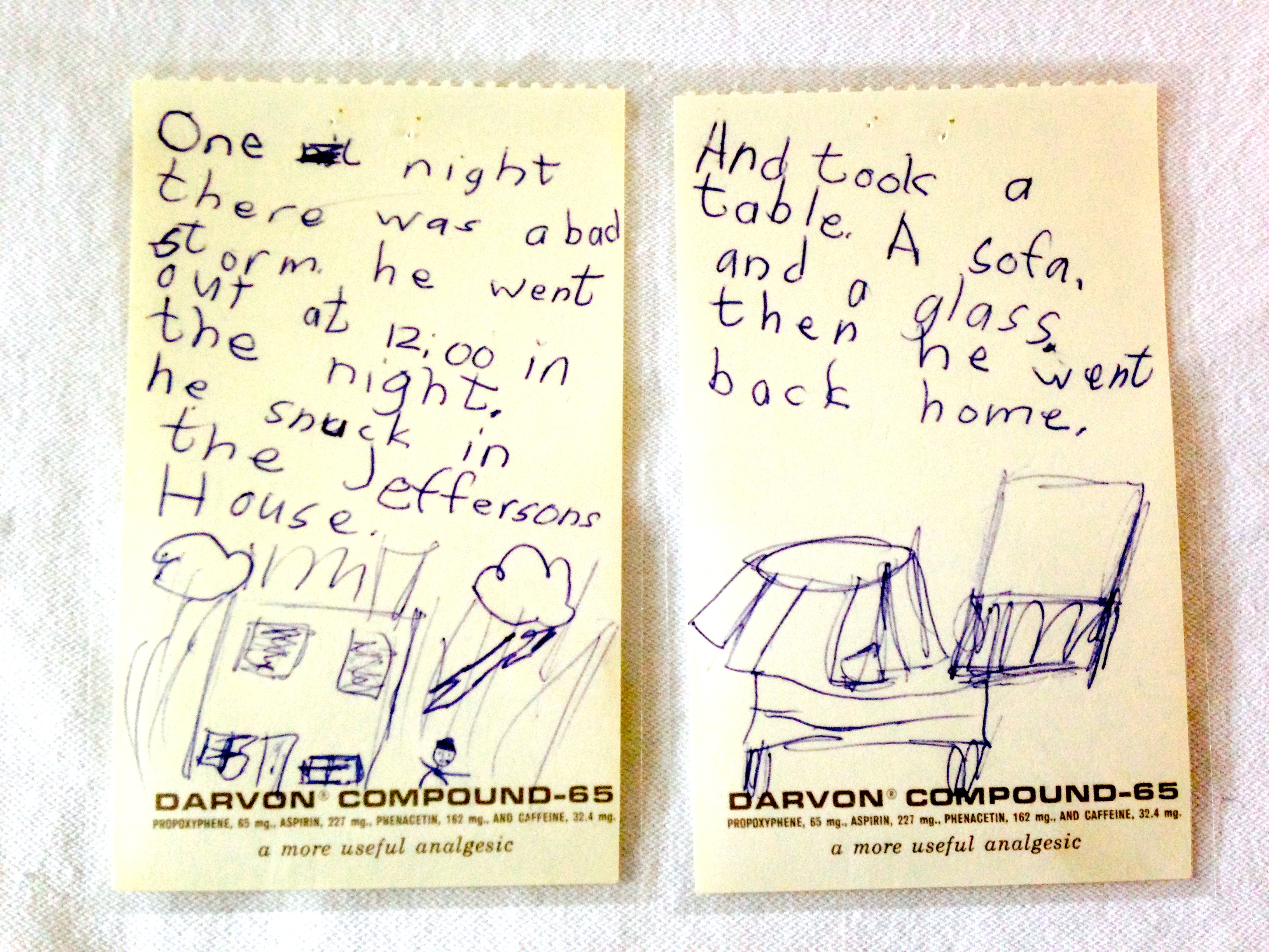 In 1964, I self-published my first story on sheets of a drug themed notepad, courtesy of my Dad’s dental office. I’m fairly certain that I used a Bic Pen–known in those days as the pen that “Writes The First Time, Every Time!” Although I’m grateful that my parents saved this little gem, I’m still wondering,  who ate my Title Page?